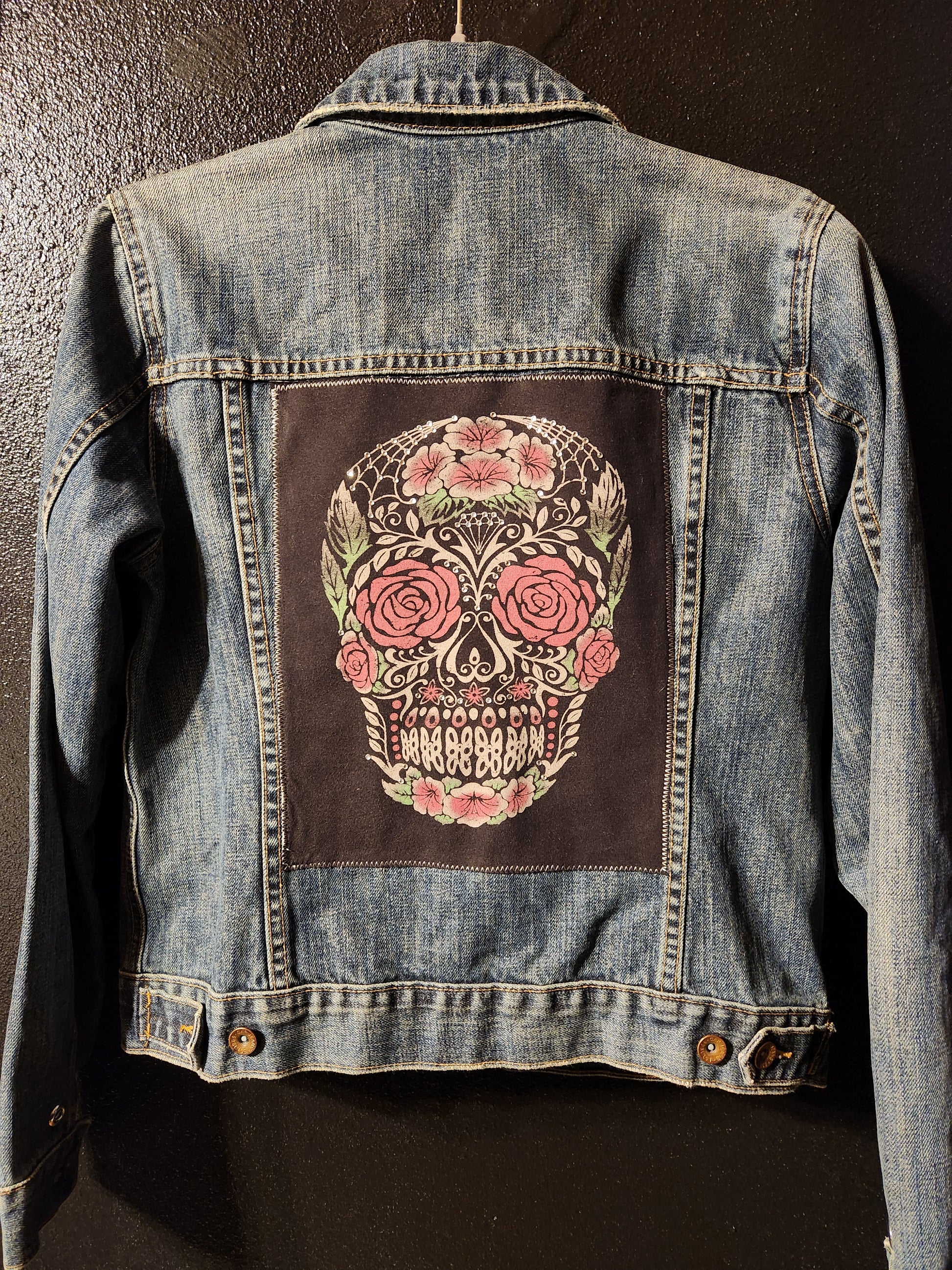 Women's L denim jacket with rose skull patch with jewel detailing.